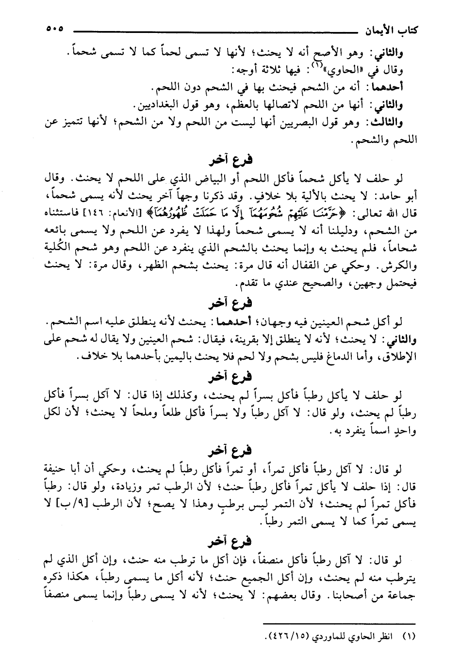 لو حلف لا يأكل شحمًا فأكل اللحم أو البياض الذي على اللحم لا يحنث. وقال أبو حامد: لا يحنث بالألية بلا خلافٍ. وقد ذكرنا وجهًا آخر يحنث لأنه يسمى شحمًا، قال الله تعالى: {حَرَّمْنَا عَلَيْهِمْ شُحُومَهُمَا إلاَّ مَا حَمَلَتْ ظُهُورُهُمَا} [الأنعام: 146] فاستثناه من الشحم، ودليلنا أنه لا يسمى شحمًا ولهذا لا يفرد عن اللحم ولا يسمى بائعه شحامًا، فلم يحنث به وإنما يحنث بالشحم الذي ينفرد عن اللحم وهو شحم الكُلية والكرش. وحكي عن القفال أنه قال مرة: يحنث بشحم الظهر، وقال مرة: لا يحنث فيحتمل وجهين، والصحيح عندي ما تقدم.