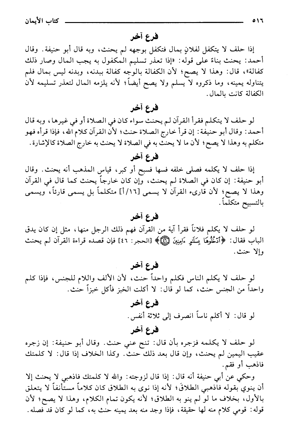 إذا حلف لا يكلمه فصلى خلفه فسها فسبح أو كبر، قياس المذهب أنه يحنث. وقال أبو حنيفة: إن كان في الصلاة لم يحنث، وإن كان خارجًا يحنث كما قال في القرآن وهذا لا يصح؛ لأن قارئ القرآن لا يسمى [16/ أ] متكلمًا بل يسمى قارئًا، ويسمى بالتسبيح متكلمًا.