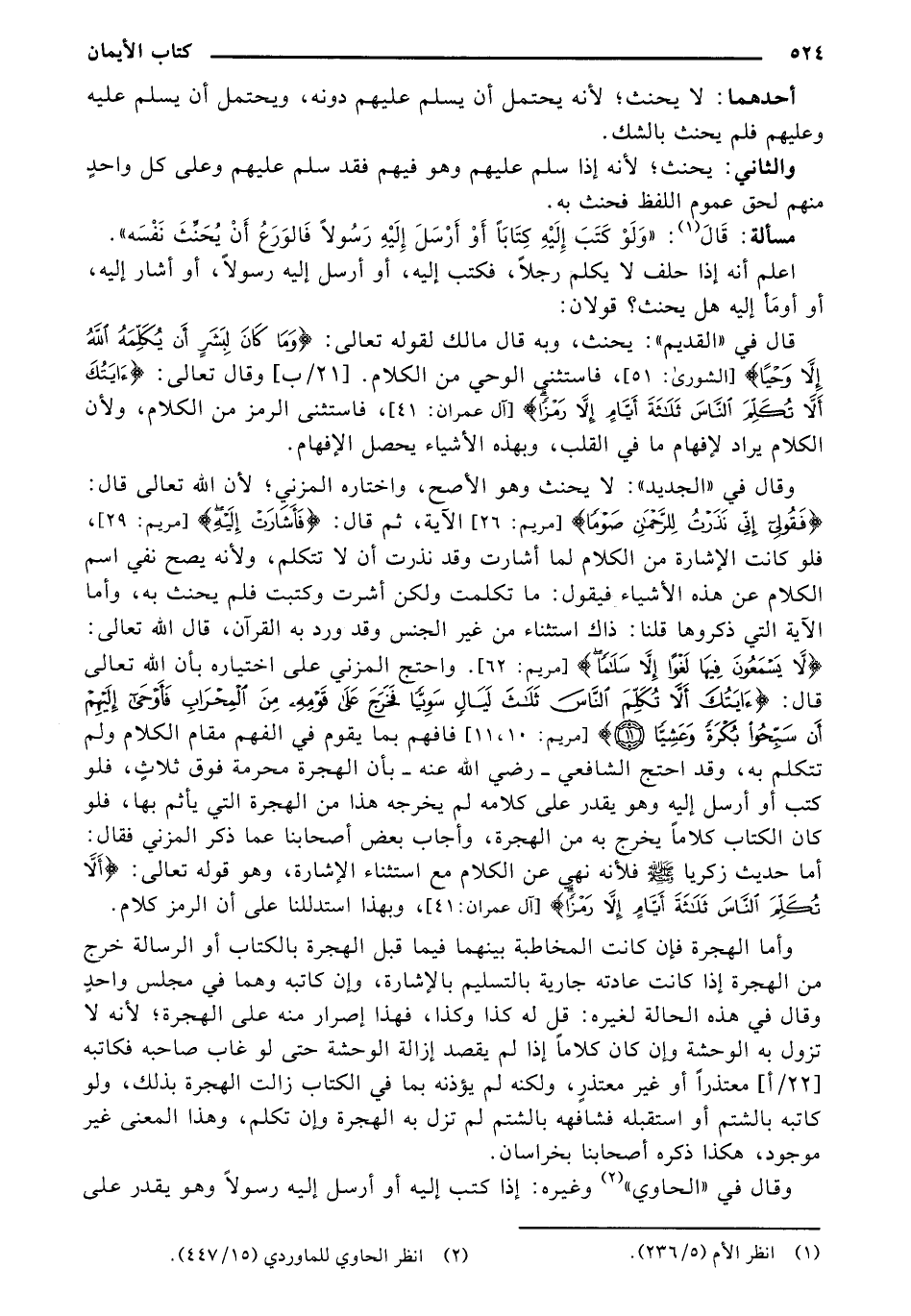 وقال في "الجديد" لا يحنث وهو الأصح، واختاره المزني؛ لأن الله تعالى قال: {فَقُولِي إنيِّ نَذَرْتُ لِلرَّحْمَنِ صَوْمًا} [مريم: 26] الآية، ثم قال: {فَأَشَارَتْ إلَيْهِ} [مريم: 29]، فلو كانت الإشارة من الكلام لما أشارت وقد نذرت أن لا تتكلم، ولنه يصح نفي اسم الكلام عن هذه الأشياء فيقول: ما تكلمت ولكن أشرت وكتبت فلم يحنث به، وأما الآية التي ذكروها قلنا: ذاك استثناء من غير الجنس وقد ورد به القرآن، قال الله تعالى: {لا يَسْمَعُونَ فِيهَا لَغْوًا إلاَّ سَلامًا} [مريم: 62]. واحتج المزني على اختياره بأن الله تعالى قال: {أَلاَّ تُكَلِّمَ النَّاسَ ثَلاثَ لَيَالٍ سَوِيًا فَخَرَجَ عَلَى قَوْمِهِ مِنَ المِحْرَابِ فَأَوْحَى إلَيْهِمْ أَن سَبِّحُوا بُكْرَةً وعَشِيًا (11)} [مريم: 10، 11] فافهم بما يقوم في الفهم مقام الكلام ولم تتكلم به، وقد احتج الشافعي - رضي الله عنه - بأن الهجرة محرمة فوق ثلاثٍ، فلو كتب أو أرسل إليه وهو يقدر على كلامه لم يخرجه هذا من الهجرة التي يأثم بها، فلو كان الكتاب كلامًا يخرج به من الهجرة، وأجاب بعض أصحابنا عما ذكر المزني فقال: أما حديث زكريا صلى الله عليه وسلم فلأنه نهي عن الكلام مع استثناء الإشارة، وهو قوله تعالى: {آيَتُكَ أَلاَّ تُكَلِّمَ النَّاسَ ثَلاثَةَ أَيَّامٍ إلاَّ رَمْزًا} [آل عمران: 41]، وبهذا استدللنا على أن الرمز كلام.