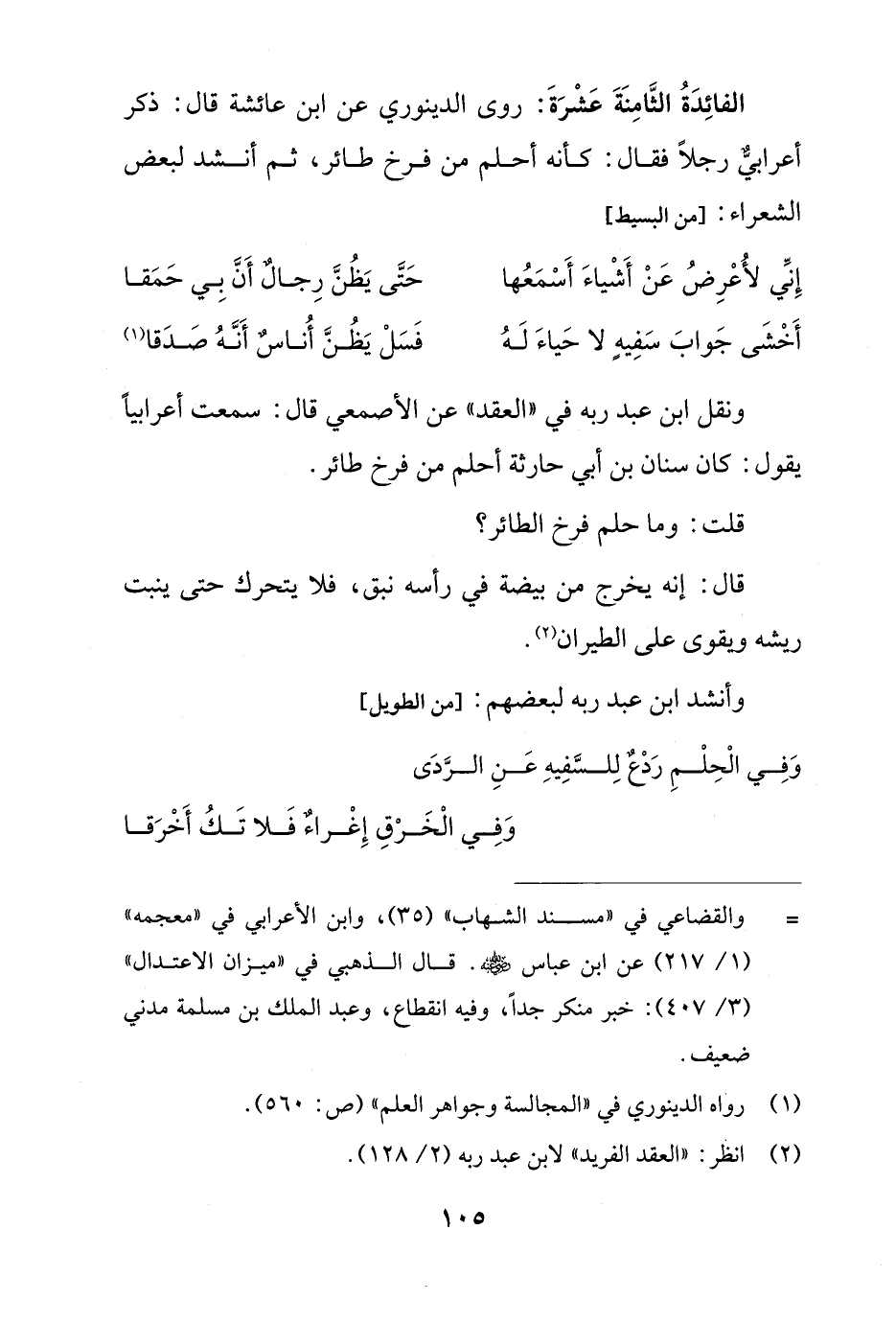 الفائِدَةُ الثَّامِنَةَ عَشْرَةَ: روى الدينوري عن ابن عائشة قال: ذكر أعرابيٌّ رجلاً فقال: كأنه أحلم من فرخ طائر، ثم أنشد لبعض الشعراء: [من البسيط]