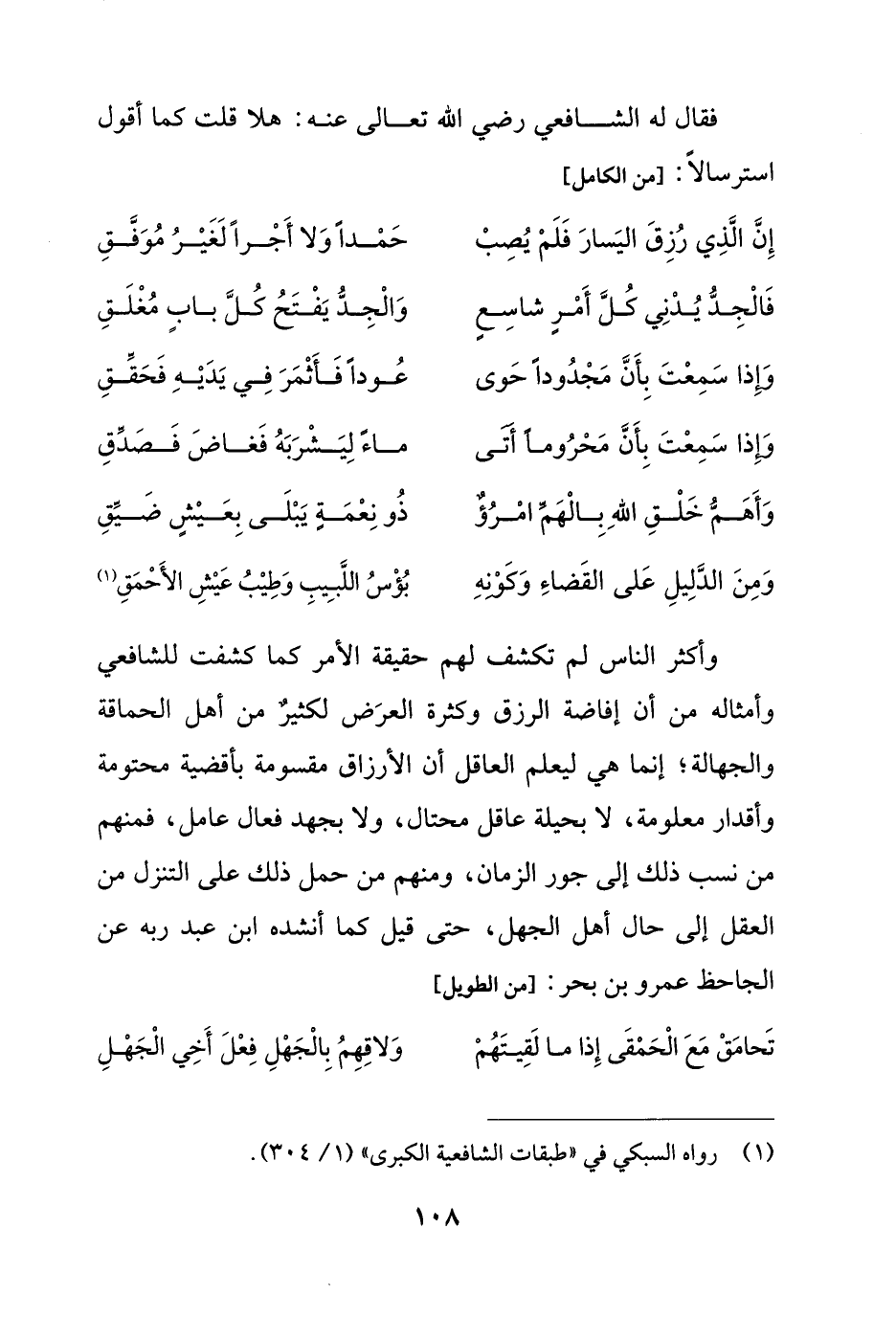 وأكثر الناس لم تكشف لهم حقيقة الأمر كما كشفت للشافعي وأمثاله من أن إفاضة الرزق وكثرة العرَض لكثيرٌ من أهل الحماقة والجهالة؛ إنما هي ليعلم العاقل أن الأرزاق مقسومة بأقضية محتومة وأقدار معلومة، لا بحيلة عاقل محتال، ولا بجهد فعال عامل، فمنهم من نسب ذلك إلى جور الزمان، ومنهم من حمل ذلك على التنزل من العقل إلى حال أهل الجهل، حتى قيل كما أنشده ابن عبد ربه عن الجاحظ عمرو بن بحر: [من الطويل]