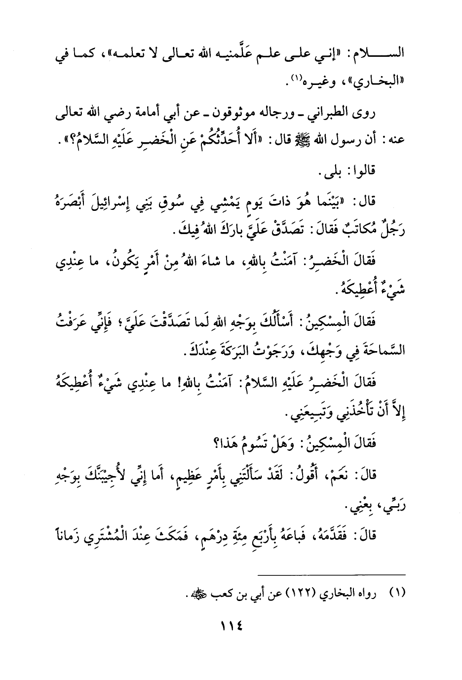 روى الطبراني - ورجاله موثوقون - عن أبي أمامة رضي الله تعالى عنه: أن رسول الله - صلى الله عليه وسلم - قال: "أَلا أُحَدِّثُكُمْ عَنِ الْخَضِر عَلَيْهِ السَّلامُ؟ ".