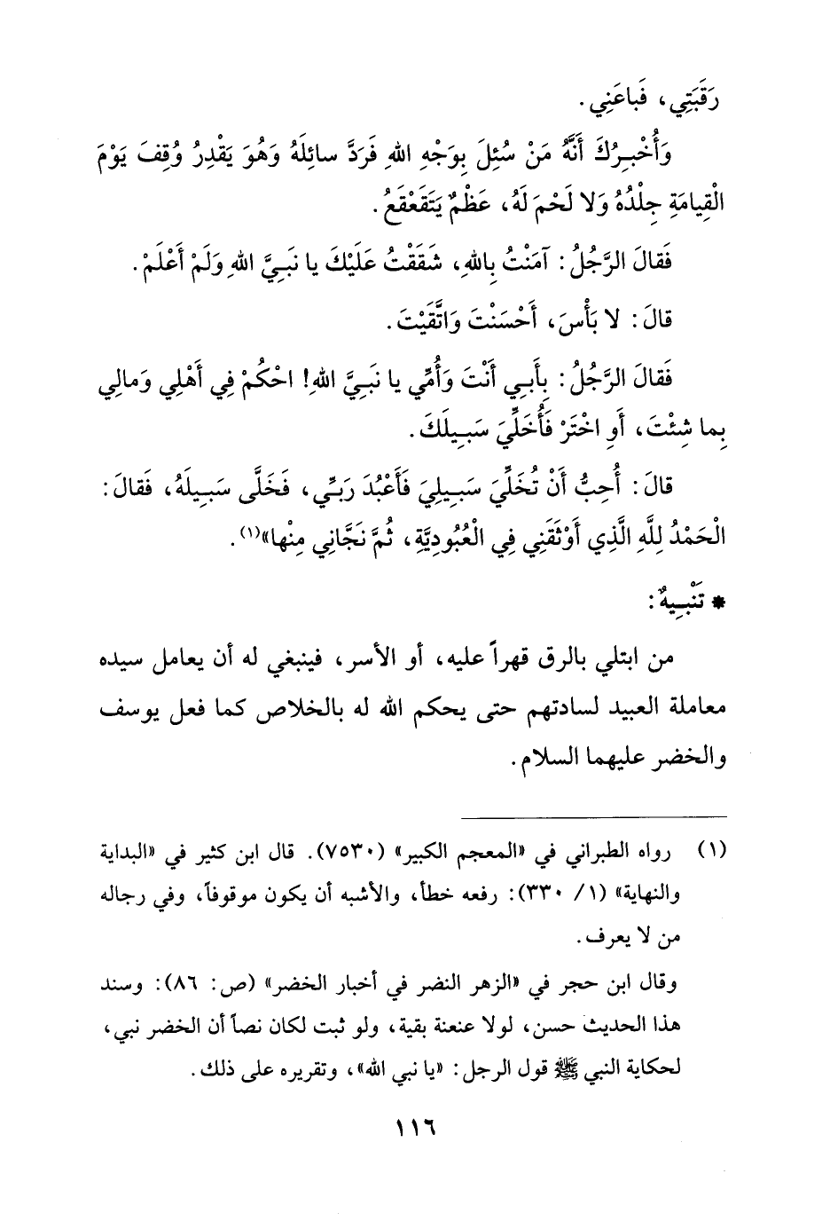 من ابتلي بالرق قهراً عليه، أو الأسر، فينبغي له أن يعامل سيده معاملة العبيد لسادتهم حتى يحكم الله له بالخلاص كما فعل يوسف والخضر عليهما السلام.