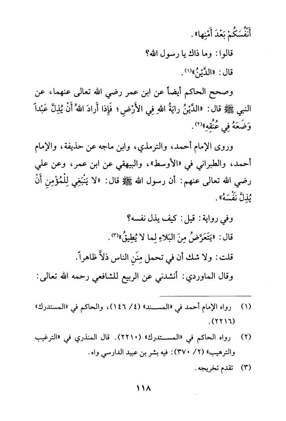وروى الإمام أحمد، والترمذي، وابن ماجه عن حذيفة، والإمام أحمد، والطبراني في "الأوسط"، والبيهقي عن ابن عمر، وعن علي رضي الله تعالى عنهم: أن رسول الله - صلى الله عليه وسلم - قال: "لا يَنْبَغِي لِلْمُؤْمِنِ أَنْ يُذِلَّ نَفْسَهُ".