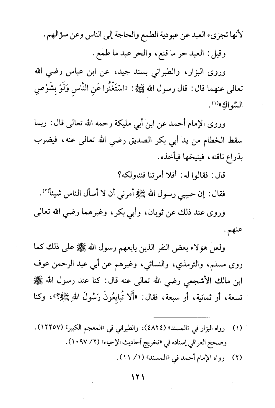 وروى البزار، والطبراني بسند جيد، عن ابن عباس رضي الله تعالى عنهما قال: قال رسول الله - صلى الله عليه وسلم -: "اسْتَغْنُوا عَنِ النَّاسِ وَلَوْ بِشَوْصِ السِّواكِ" (¬1).