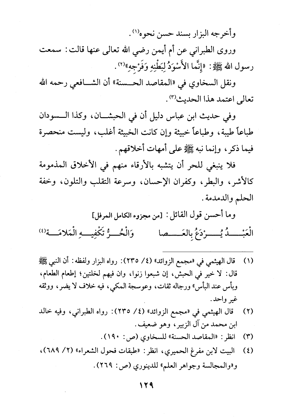 (¬1) قال الهيثمي في "مجمع الزوائد" (4/ 235): رواه البزار ولفظه: أن النبي - صلى الله عليه وسلم - قال: لا خير في الحبش، إن شبعوا زنوا، وإن فيهم لخلتين؛ إطعام الطعام، وبأس عند البأس" ورجاله ثقات، وعوسجة المكي، فيه خلاف لا يضر، ووثقه غير واحد.