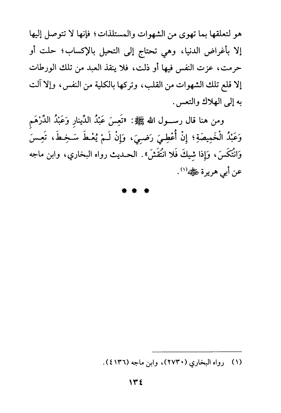 ومن هنا قال رسول الله - صلى الله عليه وسلم -: "تَعِسَ عَبْدُ الدِّينارِ وَعَبْدُ الدِّرْهَمِ وَعَبْدُ الْخَمِيصَةِ؛ إِنْ أُعْطِيَ رَضِيَ، وَإِنْ لَمْ يُعْطَ سَخِطَ، تَعِسَ وَانتكَسَ، وَإِذا شِيكَ فَلا انتُقَشَ".