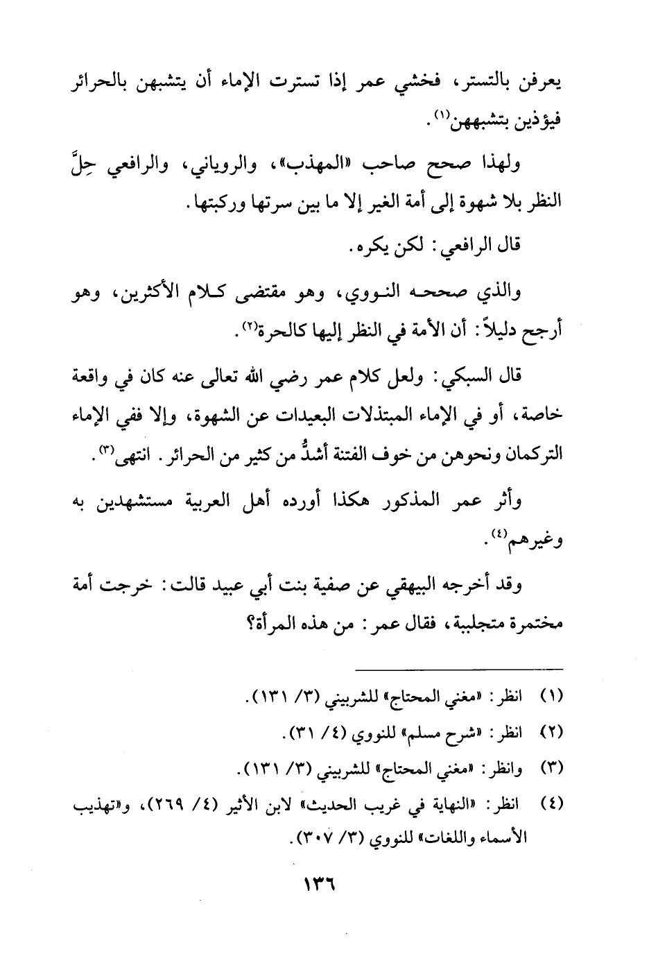 قال السبكي: ولعل كلام عمر رضي الله تعالى عنه كان في واقعة خاصة، أو في الإماء المبتذلات البعيدات عن الشهوة، وإلا ففي الإماء التركمان ونحوهن من خوف الفتنة أشدُّ من كثير من الحرائر. انتهى (¬3).