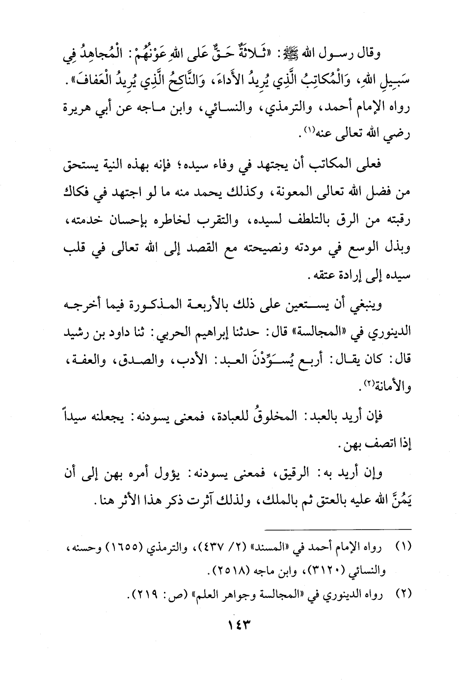 وقال رسول الله - صلى الله عليه وسلم -: "ثَلاثَهٌ حَقٌّ عَلى اللهِ عَوْنهمْ: الْمُجاهِدُ فِي سَبِيلِ اللهِ، وَالْمُكاتِبُ الَّذِي يُرِيدُ الأَداءَ، وَالنَّاكِحُ الَّذِي يُرِيدُ الْعَفافَ".