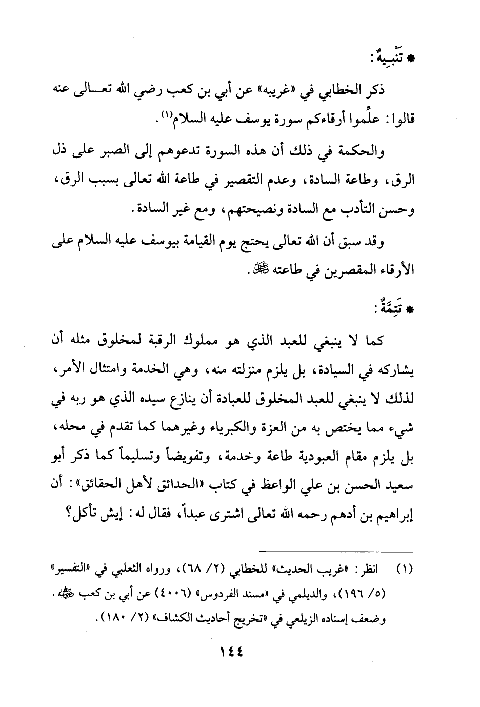 ذكر الخطابي في "غريبه" عن أبي بن كعب رضي الله تعالى عنه قالوا: علِّموا أرقاءكم سورة يوسف عليه السلام (¬1).