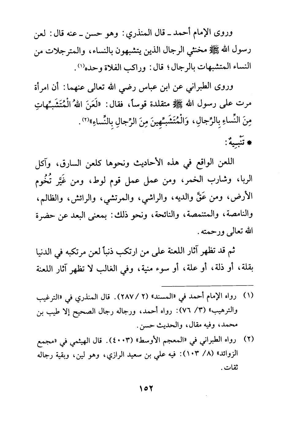 وروى الإمام أحمد - قال المنذري: وهو حسن - عنه قال: لعن رسول الله - صلى الله عليه وسلم - مخنثي الرجال الذين يتشبهون بالنساء، والمترجلات من النساء المتشبهات بالرجال؛ قال: وراكب الفلاة وحده (¬1).