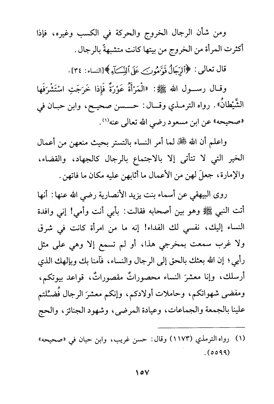 روى البيهقي عن أسماء بنت يزيد الأنصارية رضي الله عنها: أنها أتت النبي - صلى الله عليه وسلم - وهو بين أصحابه فقالت: بأبي أنت وأمي! إني وافدة النساء إليك، نفسي لك الفداء! إنه ما من امرأة كانت في شرق ولا غرب سمعت بمخرجي هذا، أو لم تسمع إلا وهي على مثل رأي؛ إن الله بعثك بالحق إلى الرجال والنساء، فآمنا بك وبإلهك الذي أرسلك، وإنا معشرَ النساء محصوراتٌ مقصوراتٌ، قواعد بيوتكم، ومفضى شهواتكم، وحاملات أولادكم، وإنكم معشرَ الرجال فُضِّلتم علينا بالجمعة والجماعات، وعيادة المرضى، وشهود الجنائز، والحج