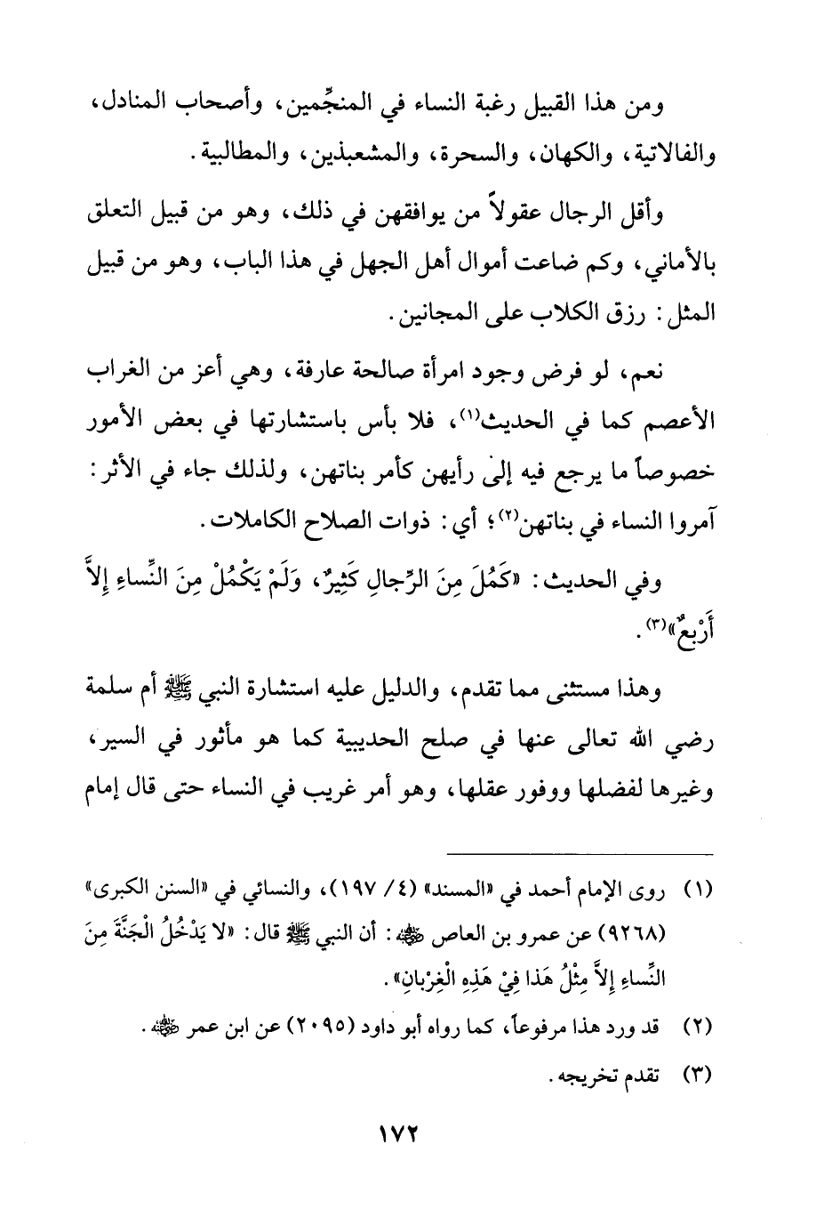 وهذا مستثنى مما تقدم، والدليل عليه استشارة النبي - صلى الله عليه وسلم - أم سلمة رضي الله تعالى عنها في صلح الحديبية كما هو مأثور في السير، وغيرها لفضلها ووفور عقلها، وهو أمر غريب في النساء حتى قال إمام