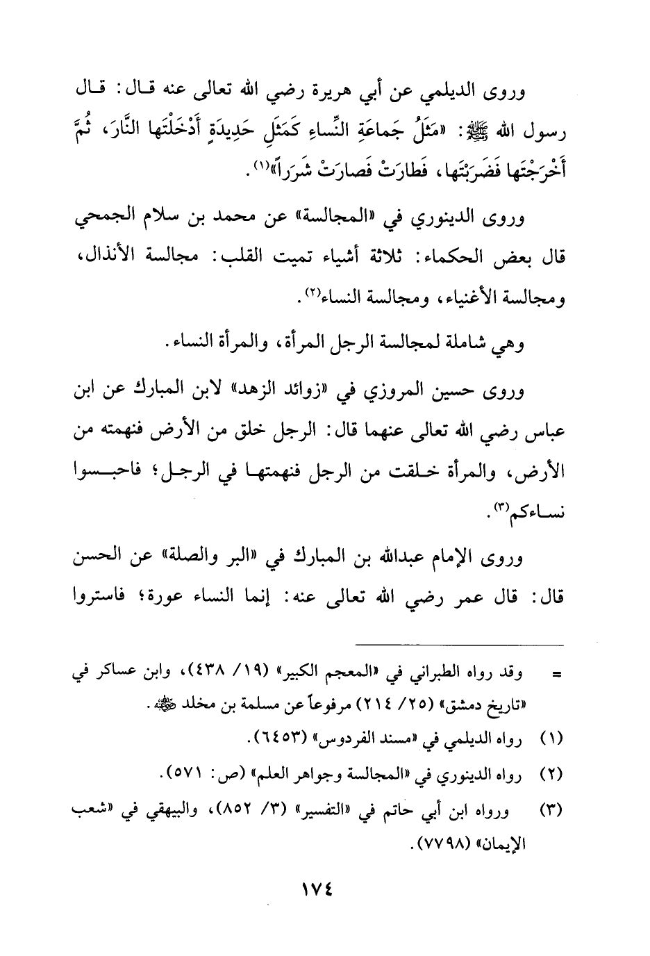 وروى الديلمي عن أبي هريرة رضي الله تعالى عنه قال: قال رسول الله - صلى الله عليه وسلم -: "مَثَلُ جَماعَةِ النِّساءِ كَمَثَلِ حَدِيدَةٍ أَدْخَلْتَها النَّارَ، ثُمَّ أَخْرَجْتَها فَضَرَبْتَها، فَطارَتْ فَصارَتْ شَرَراً" (¬1).