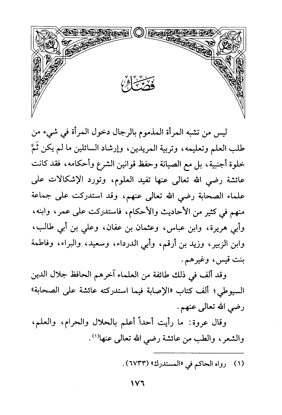 ليس من تشبه المرأة المذموم بالرجال دخول المرأة في شيء من طلب العلم وتعليمه، وتربية المريدين، وإرشاد السائلين ما لم يكن ثَمَّ خلوة أجنبية، بل مع الصيانة وحفظ قوانين الشرع وأحكامه، فقد كانت عائشة رضي الله تعالى عنها تفيد العلوم، وتورد الإشكالات على علماء الصحابة رضي الله تعالى عنهم، وقد استدركت على جماعة منهم في كثير من الأحاديث والأحكام، فاستدركت على عمر، وابنه، وأبي هريرة، وابن عباس، وعثمان بن عفان، وعلي بن أبي طالب، وابن الزبير، وزيد بن أرقم، وأبي الدرداء، وسعيد، والبراء، وفاطمة بنت قيس، وغيرهم.
