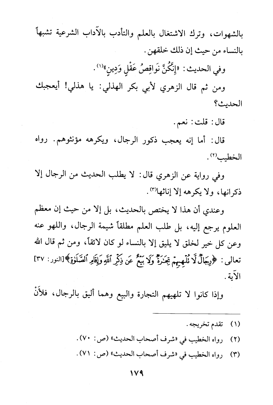 وعندي أن هذا لا يختص بالحديث، بل إلا من حيث إن معظم العلوم يرجع إليه، بل طلب العلم مطلقًا شيبة الرجال، واللهو عنه وعن كل خير لخلق لا يليق إلا بالنساء لو كان لائقاً، ومن ثم قال الله تعالى: {رِجَالٌ لَا تُلْهِيهِمْ تِجَارَةٌ وَلَا بَيْعٌ عَنْ ذِكْرِ اللَّهِ وَإِقَامِ الصَّلَاةِ} [النور: 37] الآية.