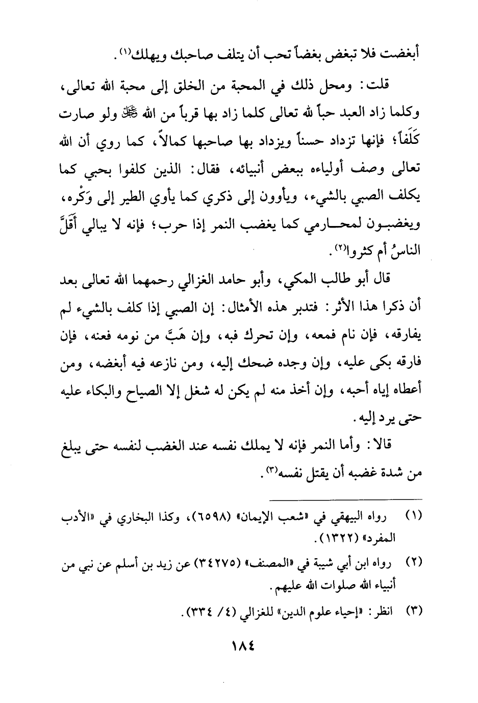 قلت: ومحل ذلك في المحبة من الخلق إلى محبة الله تعالى، وكلما زاد العبد حبا لله تعالى كما زاد بها قربا من الله - عز وجل - ولو صارت كَلَفاً؛ فإنها تزداد حسناً ويزداد بها صاحبها كمالاً، كما روي أن الله تعالى وصف أولياءه ببعض أنبيائه، فقال: الذين كلفوا بحبي كما يكلف الصبي بالشيء، ويأوون إلى ذكري كما يأوي الطير إلى وَكْره، ويغضبون لمحارمي كما يغضب النمر إذا حرب؛ فإنه لا يبالي أَقَلَّ الناسُ أم كثروا (¬2).