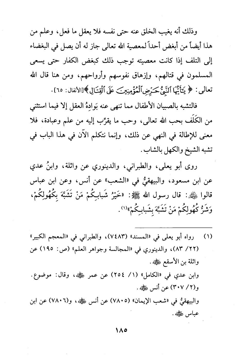 فالتشبه بالصبيان الأطفال مما تنهى عنه بَوادِهُ العقل إلا فيما استثني من الكَلَف بحب الله تعالى، وحب ما يقرِّب إليه من علم وعبادة، فلا معنى للإطالة في النهي عن ذلك، وإنما نتكلم الآن في هذا الباب في تشبه الشيخ والكهل بالشاب.