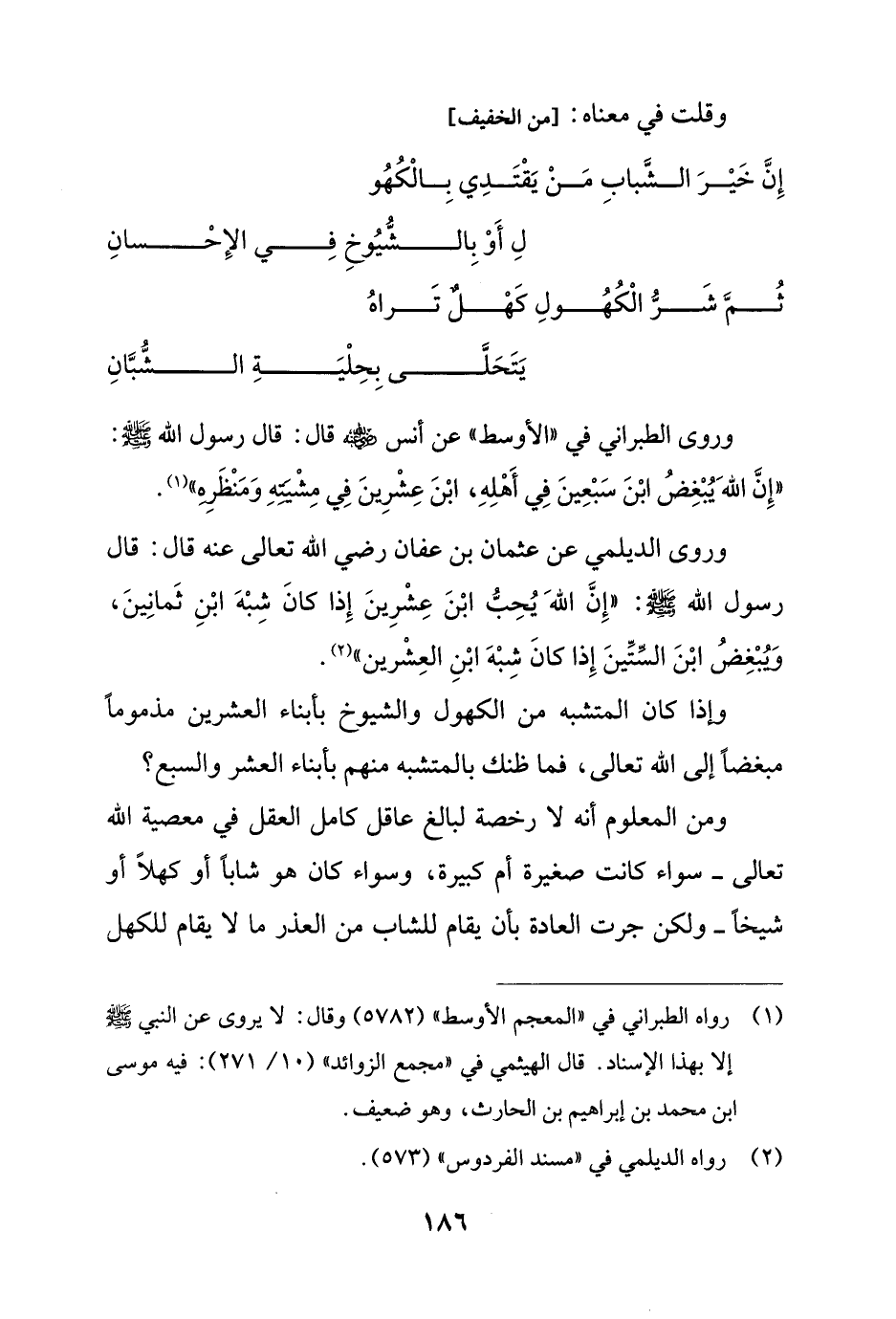 وروى الديلمي عن عثمان بن عفان رضي الله تعالى عنه قال: قال رسول الله - صلى الله عليه وسلم -: "إِنَّ اللهَ يُحِبُّ ابْنَ عِشْرِينَ إِذا كانَ شِبْهَ ابْنِ ثَمانِينَ، وَيُبْغِضُ ابْنَ السِّتِّينَ إِذا كانَ شِبْهَ ابْنِ العِشْرين" (¬2).