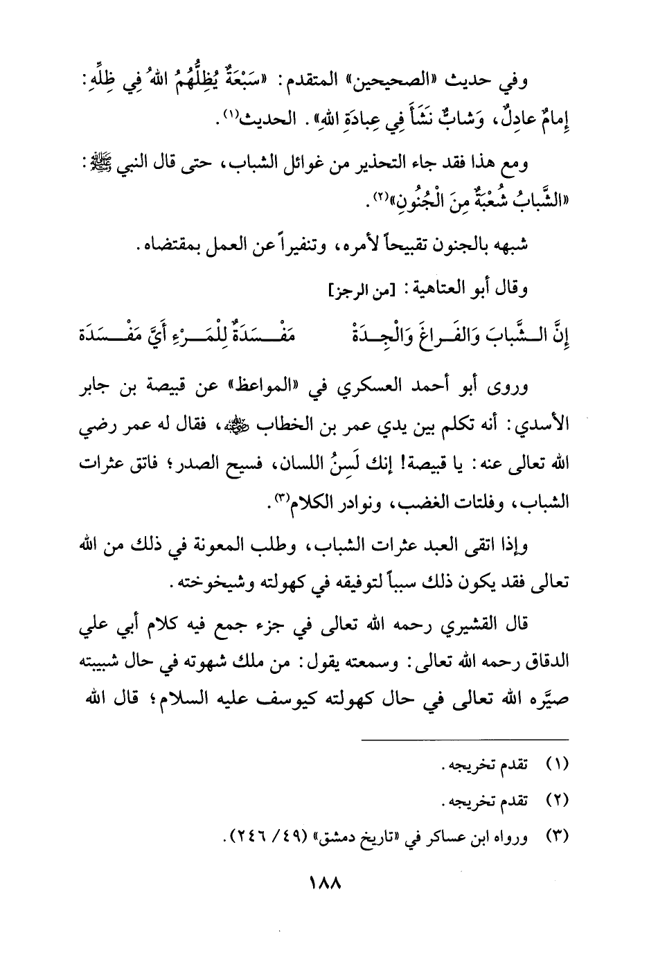 ومع هذا فقد جاء التحذير من غوائل الشباب، حتى قال النبي - صلى الله عليه وسلم -: "الشَّبابُ شُعْبَةٌ مِنَ الْجُنُونِ" (¬2).