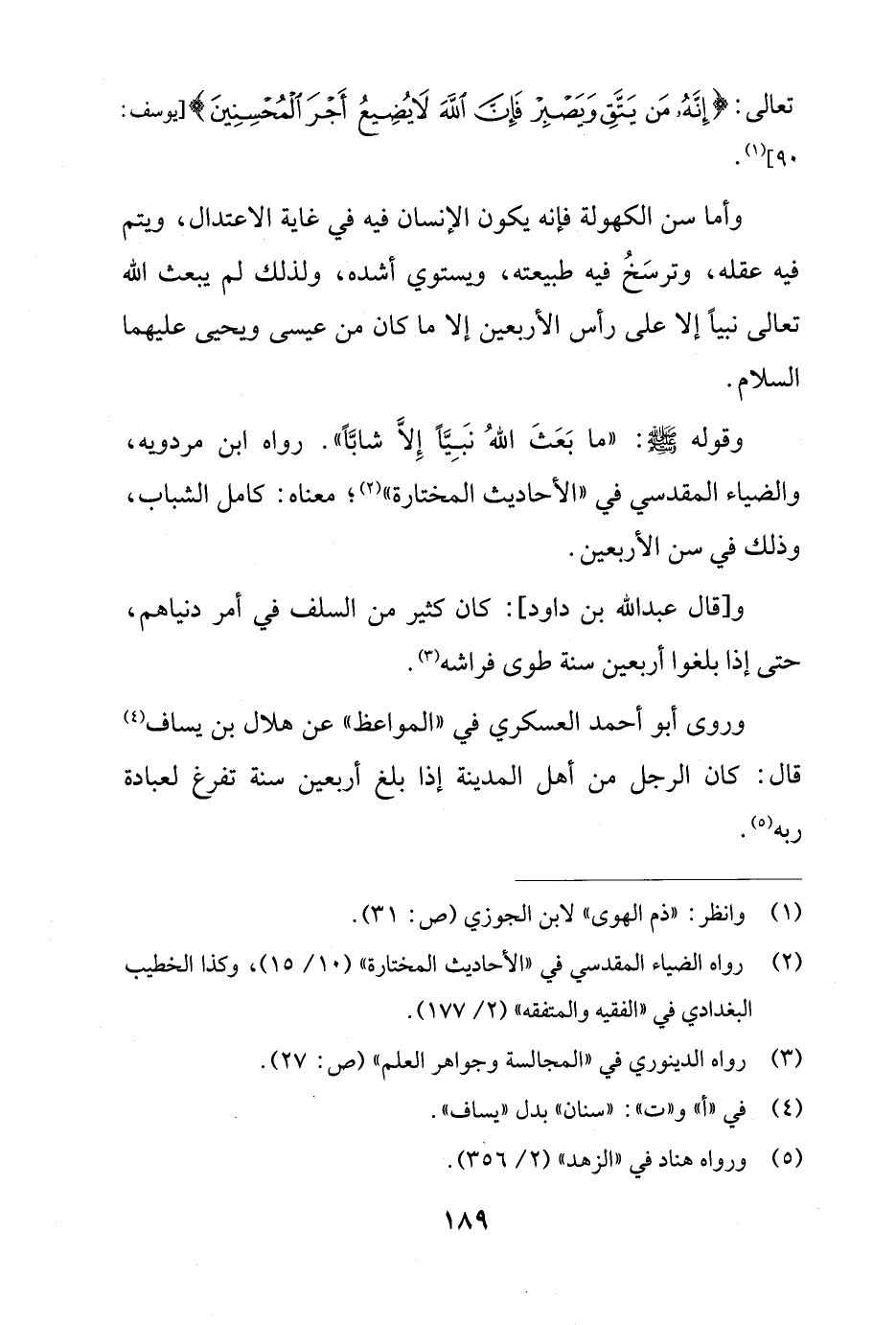 وأما سن الكهولة فإنه يكون الإنسان فيه في غاية الاعتدال، ويتم فيه عقله، وترسَخُ فيه طبيعته، ويستوي أشده، ولذلك لم يبعث الله تعالى نبيًا إلا على رأس الأربعين إلا ما كان من عيسى ويحيى عليهما السلام.