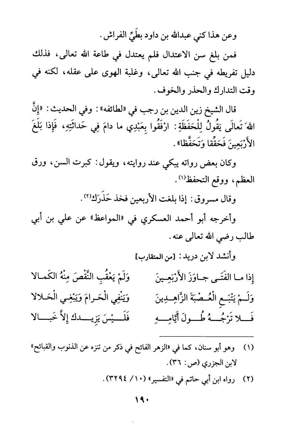 قال الشيخ زين الدين بن رجب في "لطائفه": وفي الحديث: "إِنَّ اللهَ تَعالَى يَقُولُ لِلْحَفَظَةِ: ارْفَقُوا بِعَبْدِي ما دامَ فِي حَداثَتِهِ، فَإِذا بَلَغَ الأَرْبَعِينَ فَحَقِّقا وَتَحَفَّظا".