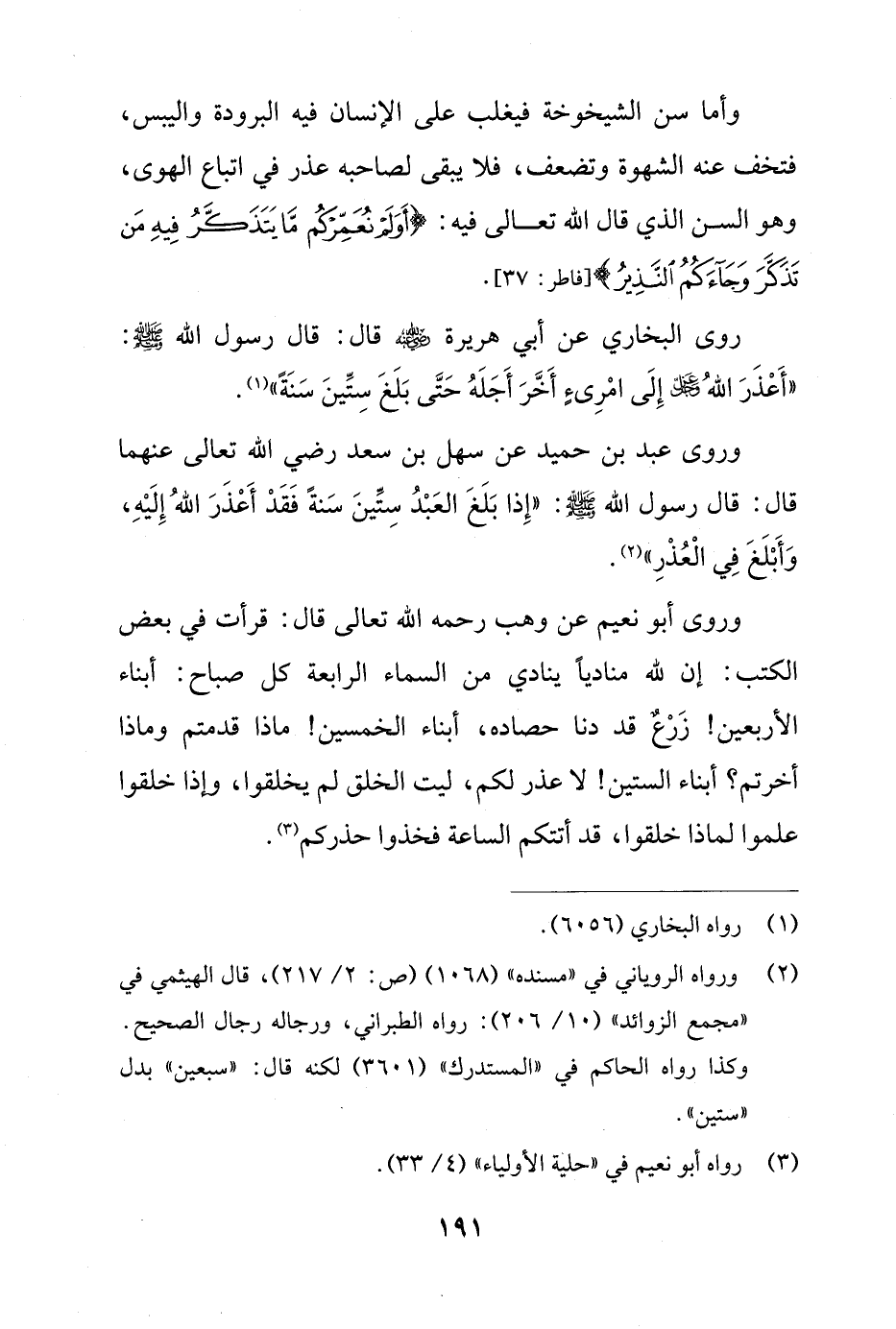 روى البخاري عن أبي هريرة - رضي الله عنه - قال: قال رسول الله - صلى الله عليه وسلم -: "أَعْذَرَ اللهُ - عز وجل - إِلَى امْرِئٍ أَخَّرَ أَجَلَهُ حَتَّى بَلَغَ سِتِّينَ سَنَةً" (¬1).