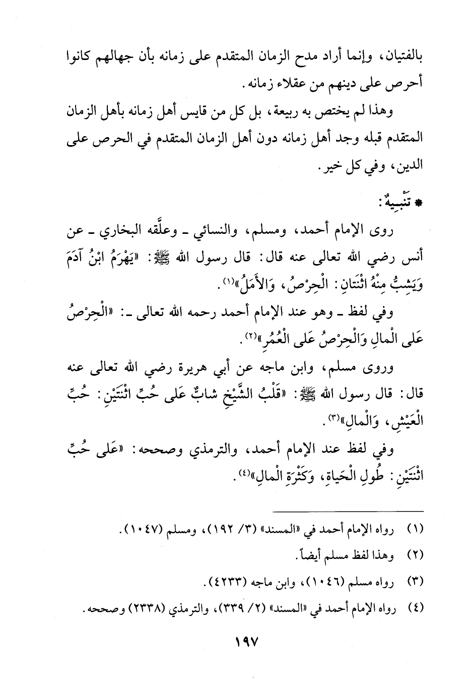 وروى مسلم، وابن ماجه عن أبي هريرة رضي الله تعالى عنه قال: قال رسول الله - صلى الله عليه وسلم -: "قَلْبُ الشَّيْخِ شابٌّ عَلى حُبِّ اثْنتَيْنِ: حُبِّ الْعَيْشِ، وَالْمالِ" (¬3).