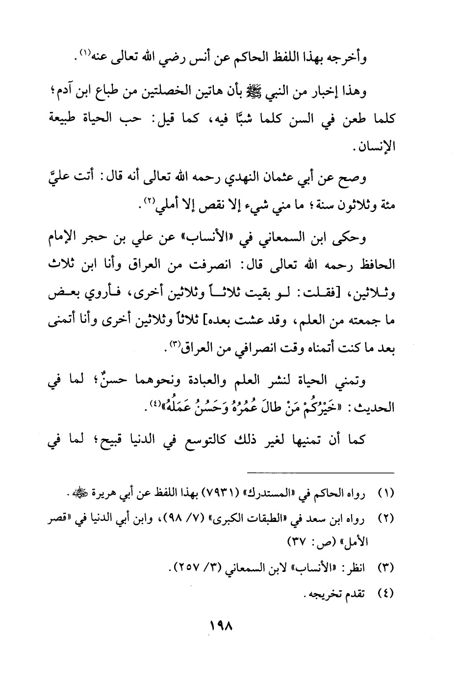 وحكى ابن السمعاني في "الأنساب" عن علي بن حجر الإمام الحافظ رحمه الله تعالى قال: انصرفت من العراق وأنا ابن ثلاث وثلاثين، [فقلت: لو بقيت ثلاثًا وثلاثين أخرى، فأروي بعض ما جمعته من العلم، وقد عشت بعده] ثلاثًا وثلاثين أخرى وأنا أتمنى بعد ما كنت أتمناه وقت انصرافي من العراق (¬3).