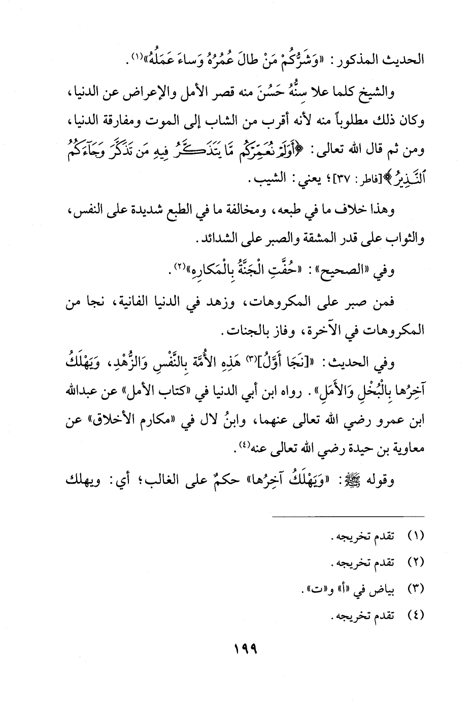 الحديث المذكور: "وَشَرُّكُمْ مَنْ طالَ عُمُرُهُ وَساءَ عَمَلُهُ" (¬1).