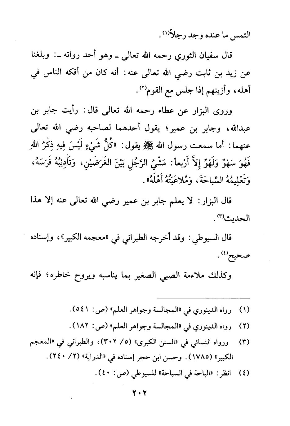 وروى البزار عن عطاء رحمه الله تعالى قال: رأيت جابر بن عبد الله، وجابر بن عمير؛ يقول أحدهما لصاحبه رضي الله تعالى عنهما: أما سمعت رسول الله - صلى الله عليه وسلم - يقول: "كُلُّ شَيْءٍ لَيْسَ فِيهِ ذِكْرُ اللهِ فَهُوَ سَهْوٌ وَلَهْوٌ إِلاَّ أَرْبعاً: مَشْيُ الرَّجُلِ بَيْنَ الغَرَضَيْنِ، وَتأْدِيْبُهُ فَرَسَهُ، وَتَعْلِيمُهُ السِّباحَةَ، وَمُلاعَبَتُهُ أَهْلَهُ".