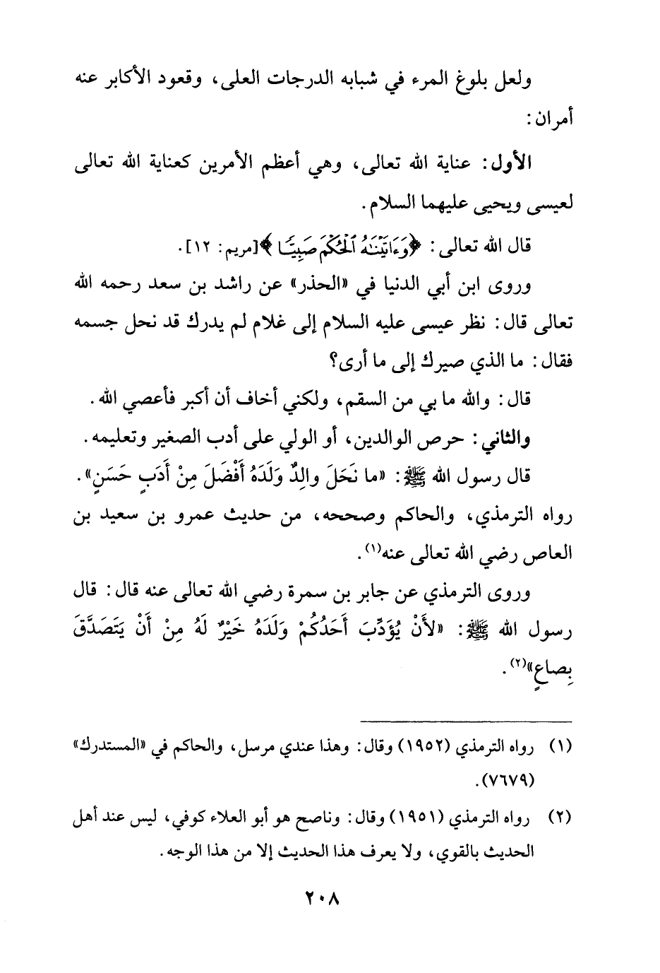الأول: عناية الله تعالى، وهي أعظم الأمرين كعناية الله تعالى لعيسى ويحيى عليهما السلام.