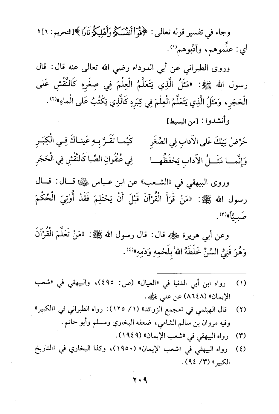 وجاء في تفسير قوله تعالى: {قُوا أَنْفُسَكُمْ وَأَهْلِيكُمْ نَارًا} [التحريم: 6]؛ أي؛ علِّموهم، وأدِّبوهم (¬1).