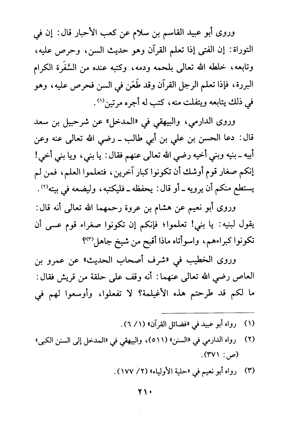 وروى الدارمي، والبيهقي في "المدخل" عن شرحبيل بن سعد قال: دعا الحسن بن علي بن أبي طالب - رضي الله تعالى عنه وعن أبيه - بنيه وبني أخيه رضي الله تعالى عنهم فقال: يا بني، ويا بني أخي! إنكم صغار قوم أوشك أن تكونوا كبار آخرين، فتعلموا العلم، فمن لم يستطع منكم أن يرويه - أو قال: يحفظه - فليكتبه، وليضعه في بيته (¬2).