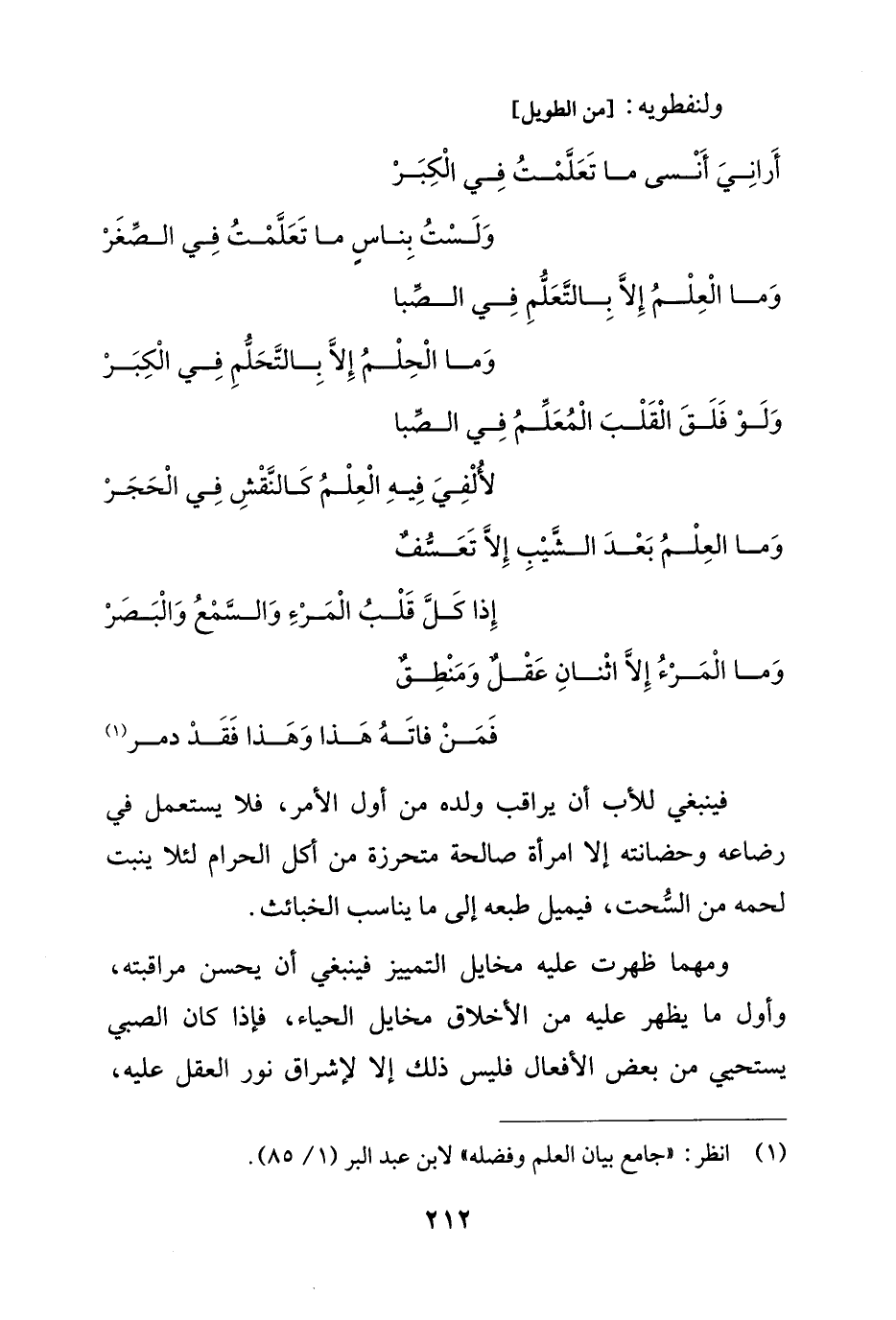 أَرانِيَ أَنْسى ما تَعَلَّمْتُ فِي الْكِبَرْ ... وَلَسْتُ بِناسٍ ما تَعَلَّمْتُ فِي الصِّغَرْ