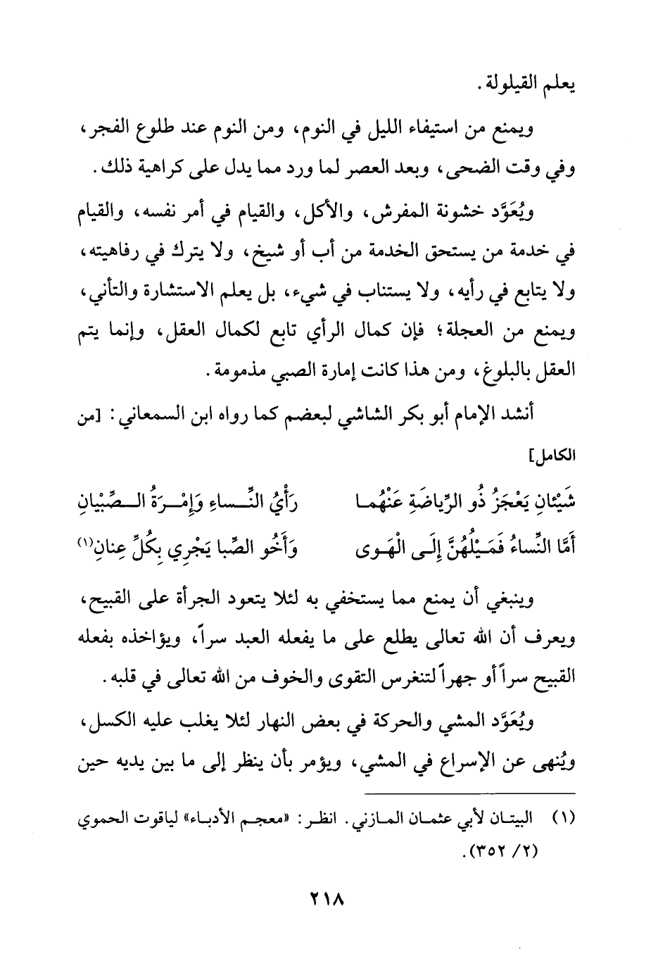 وُيعَوَّد خشونة المفرش، والأكل، والقيام في أمر نفسه، والقيام في خدمة من يستحق الخدمة من أب أو شيخ، ولا يترك في رفاهيته، ولا يتابع في رأيه، ولا يستناب في شيء، بل يعلم الاستشارة والتأني، ويمنع من العجلة؛ فإن كمال الرأي تابع لكمال العقل، وإنما يتم العقل بالبلوغ، ومن هذا كانت إمارة الصبي مذمومة.
