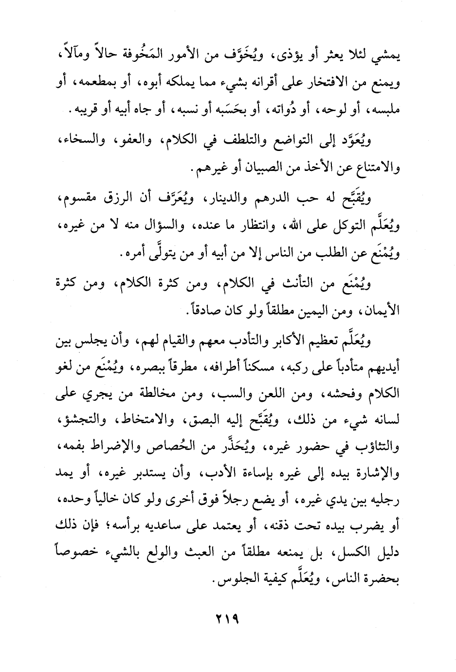 ويُعَلَّم تعظيم الأكابر والتأدب معهم والقيام لهم، وأن يجلس بين أيديهم متأدباً على ركبه، مسكناً أطرافه، مطرقاً ببصره، ويُمْنَع من لغو الكلام وفحشه، ومن اللعن والسب، ومن مخالطة من يجري على لسانه شيء من ذلك، ويُقَبَّح إليه البصق، والامتخاط، والتجشؤ، والتثاؤب في حضور غيره، ويُحَذَّر من الحُصاص والإضراط بفمه، والإشارة بيده إلى غيره بإساءة الأدب، وأن يستدبر غيره، أو يمد رجليه بين يدي غيره، أو يضع رجلًا فوق أخرى ولو كان خاليًا وحده، أو يضرب بيده تحت ذقنه، أو يعتمد على ساعديه برأسه؛ فإن ذلك دليل الكسل، بل يمنعه مطلقًا من العبث والولع بالشيء خصوصاً بحضرة الناس، ويُعَلَّم كيفية الجلوس.