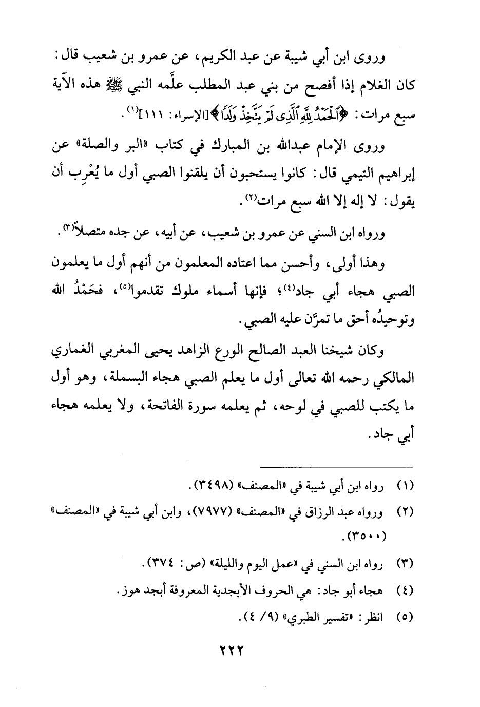 وروى ابن أبي شيبة عن عبد الكريم، عن عمرو بن شعيب قال: كان الغلام إذا أفصح من بني عبد المطلب علَّمه النبي - صلى الله عليه وسلم - هذه الآية سبع مرات: {الْحَمْدُ لِلَّهِ الَّذِي لَمْ يَتَّخِذْ وَلَدًا} [الإسراء: 111] (¬1).