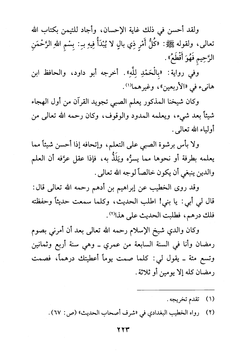 وقد روى الخطيب عن إبراهيم بن أدهم رحمه الله تعالى قال: قال لي أبي: يا بني! اطلب الحديث، وكلما سمعت حديثاً وحفظته فلك درهم، فطلبت الحديث على هذا (¬2).