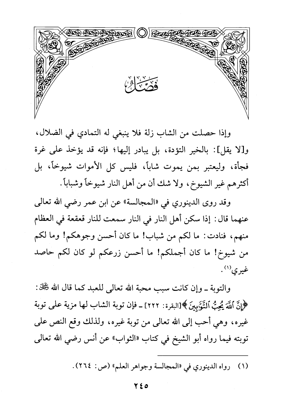 وإذا حصلت من الشاب زلة فلا ينبغي له التمادي في الضلال، و [لا يقل]: بالخير التؤدة، بل يبادر إليها؛ فإنه قد يؤخذ على غرة فجأة، وليعتبر بمن يموت شابًا، فليس كل الأموات شيوخاً، بل أكثرهم غير الشيوخ، ولا شك أن من أهل النار شيوخاً وشباباً.