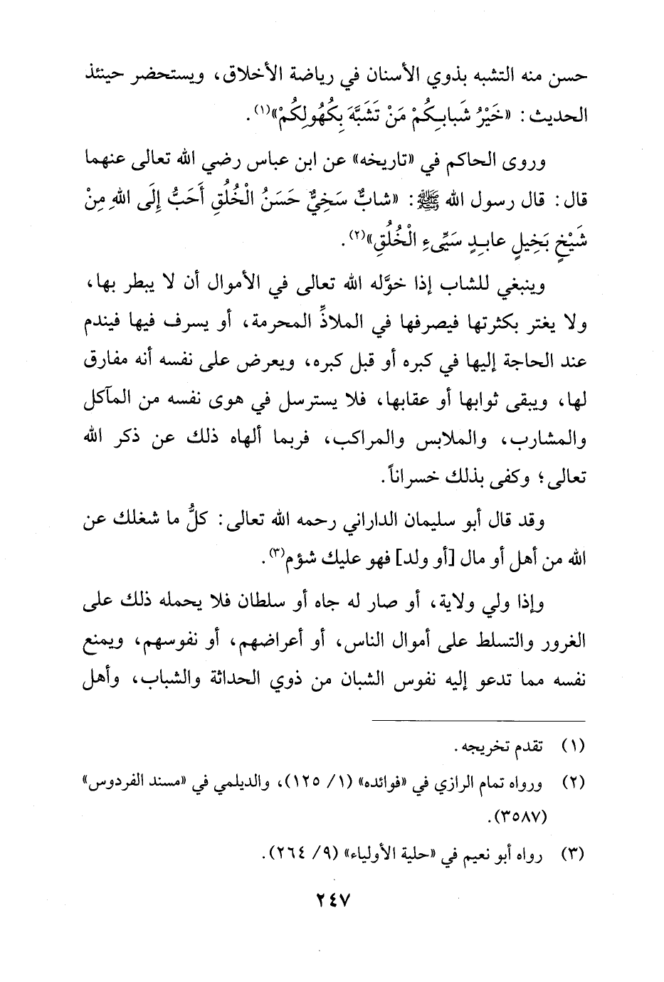 وروى الحاكم في "تاريخه" عن ابن عباس رضي الله تعالى عنهما قال: قال رسول الله - صلى الله عليه وسلم -: "شابٌّ سَخِىٌّ حَسَنُ الْخُلُقِ أَحَبُّ إِلَى اللهِ مِنْ شَيْخٍ بَخِيلٍ عابِدٍ سَيِّئِ الْخُلُقِ" (¬2).
