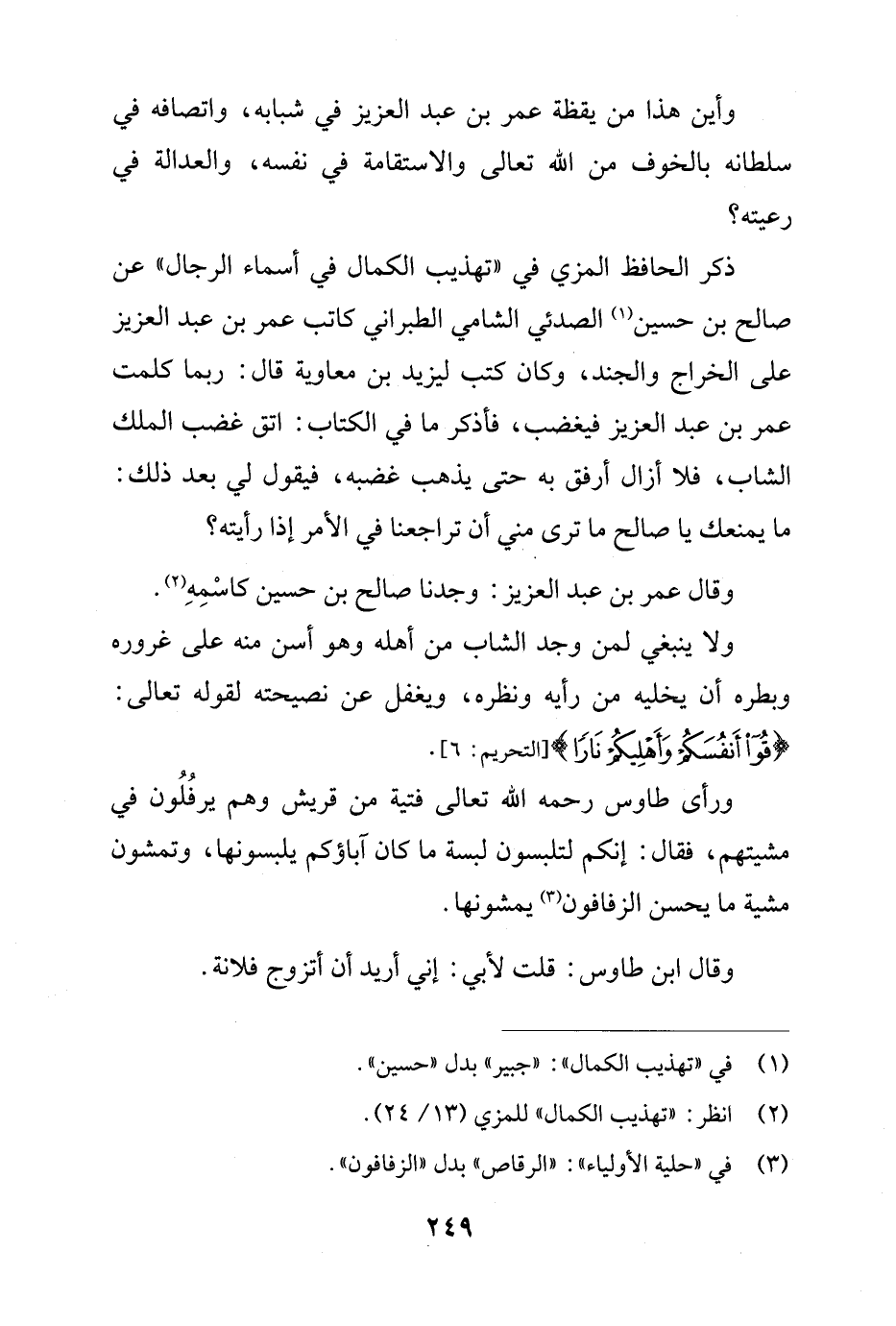 وأين هذا من يقظة عمر بن عبد العزيز في شبابه، واتصافه في سلطانه بالخوف من الله تعالى والاستقامة في نفسه، والعدالة في رعيته؟