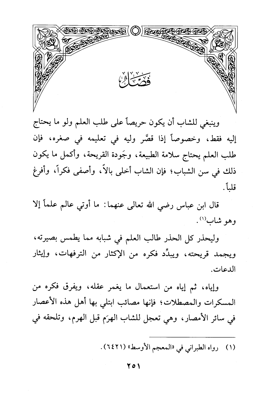 وليحذر كل الحذر طالب العلم في شبابه مما يطمس بصيرته، ويجمد قريحته، ويبدِّد فكره من الإكثار من الترفهات، وإيثار الدعات.