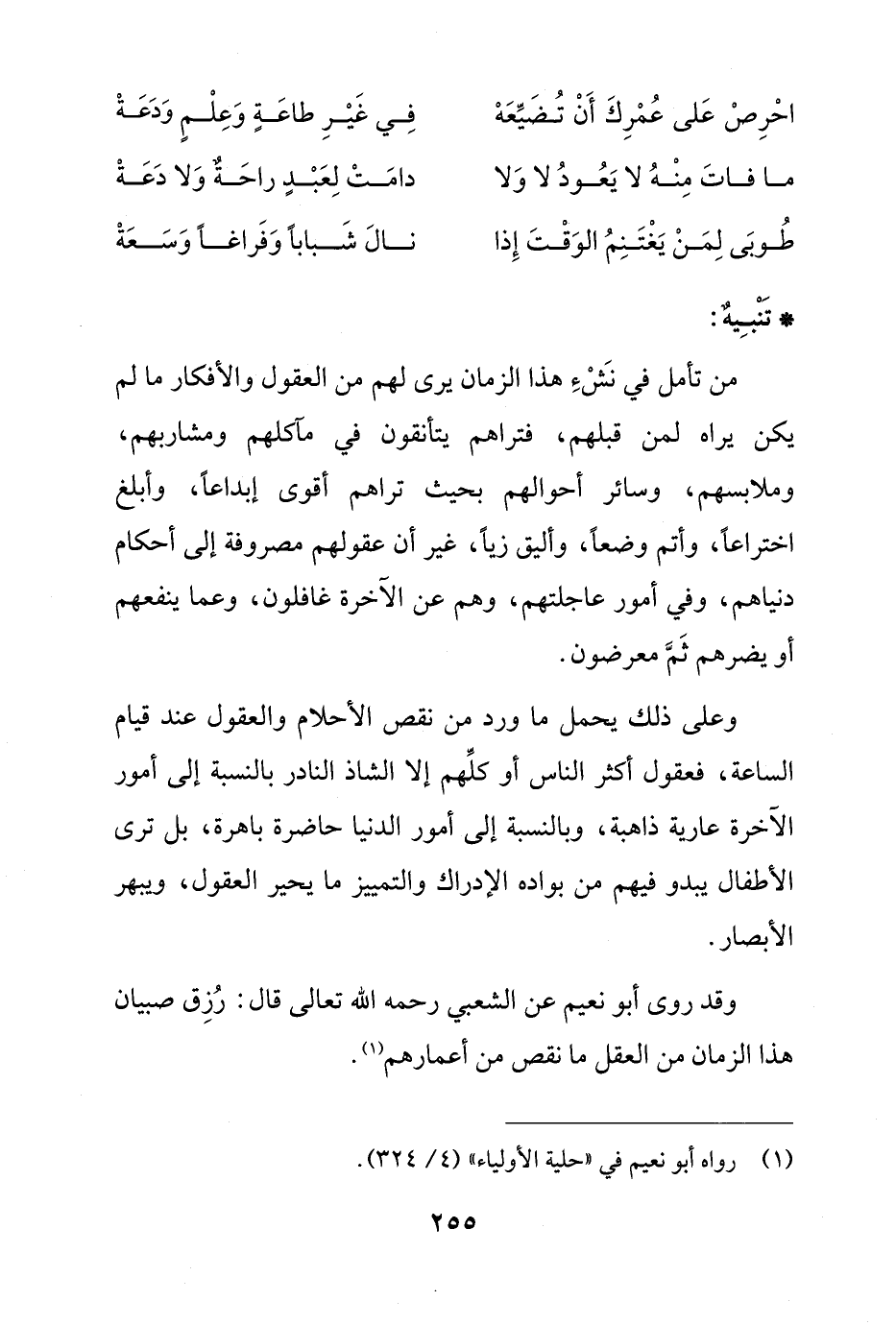 من تأمل في نَشْءِ هذا الزمان يرى لهم من العقول والأفكار ما لم يكن يراه لمن قبلهم، فتراهم يتأنقون في مآكلهم ومشاربهم، وملابسهم، وسائر أحوالهم بحيث تراهم أقوى إبداعاً، وأبلغ اختراعاً، وأتم وضعاً، وأليق زياً، غير أن عقولهم مصروفة إلى أحكام دنياهم، وفي أمور عاجلتهم، وهم عن الآخرة غافلون، وعما ينفعهم أو يضرهم ثَمَّ معرضون.
