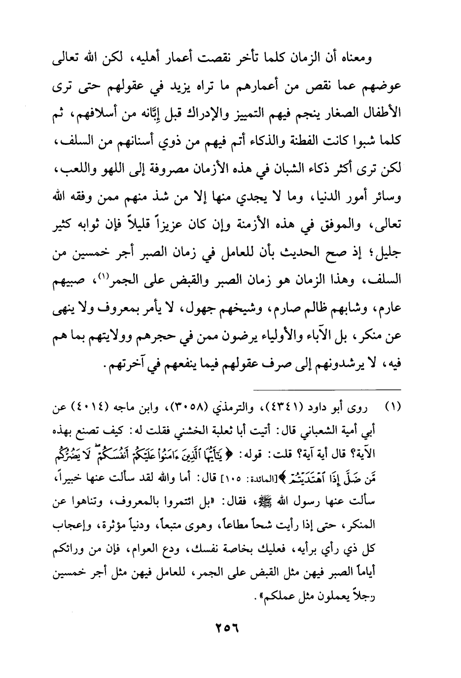 (¬1) روى أبو داود (4341)، والترمذي (3058)، وابن ماجه (4514) عن أبي أمية الشعباني قال: أتيت أبا ثعلبة الخشني فقلت له: كيف تصنع بهذه الآية؟ قال أية آية؟ قلت: قوله: {يَا أَيُّهَا الَّذِينَ آمَنُوا عَلَيْكُمْ أَنْفُسَكُمْ لَا يَضُرُّكُمْ مَنْ ضَلَّ إِذَا اهْتَدَيْتُمْ} [المائدة: 105] قال: أما والله لقد سألت عنها خبيراً، سألت عنها رسول الله - صلى الله عليه وسلم -، فقال: "بل ائتمروا بالمعروف، وتناهوا عن المنكر، حتى إذا رأيت شحاً مطاعاً، وهوى متبعاً، ودنياً مؤثرة، وإعجاب كل ذي رأي برأيه، فعليك بخاصة نفسك، ودع العوام، فإن من ورائكم أيامًا الصبر فيهن مثل القبض على الجمر، للعامل فيهن مثل أجر خمسين رجلًا يعملون مثل عملكم".