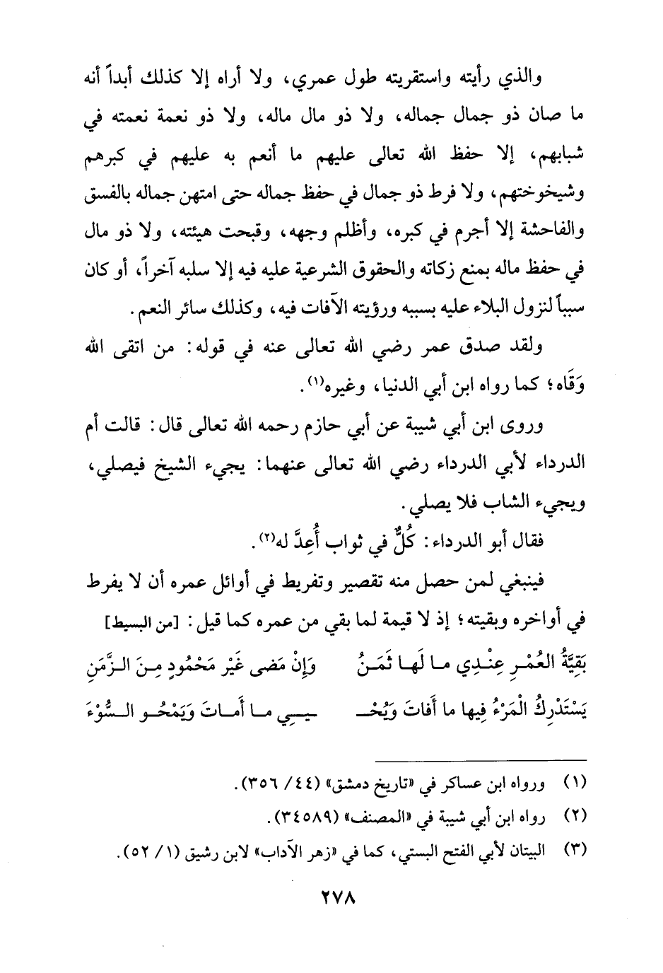 والذي رأيته واستقريته طول عمري، ولا أراه إلا كذلك أبدًا أنه ما صان ذو جمال جماله، ولا ذو مال ماله، ولا ذو نعمة نعمته في شبابهم، إلا حفظ الله تعالى عليهم ما أنعم به عليهم في كبرهم وشيخوختهم، ولا فرط ذو جمال في حفظ جماله حتى امتهن جماله بالفسق والفاحشة إلا أجرم في كبره، وأظلم وجهه، وقبحت هيئته، ولا ذو مال في حفظ ماله بمنع زكاته والحقوق الشرعية عليه فيه إلا سلبه آخراً، أو كان سبباً لنزول البلاء عليه بسببه ورؤيته الآفات فيه، وكذلك سائر النعم.
