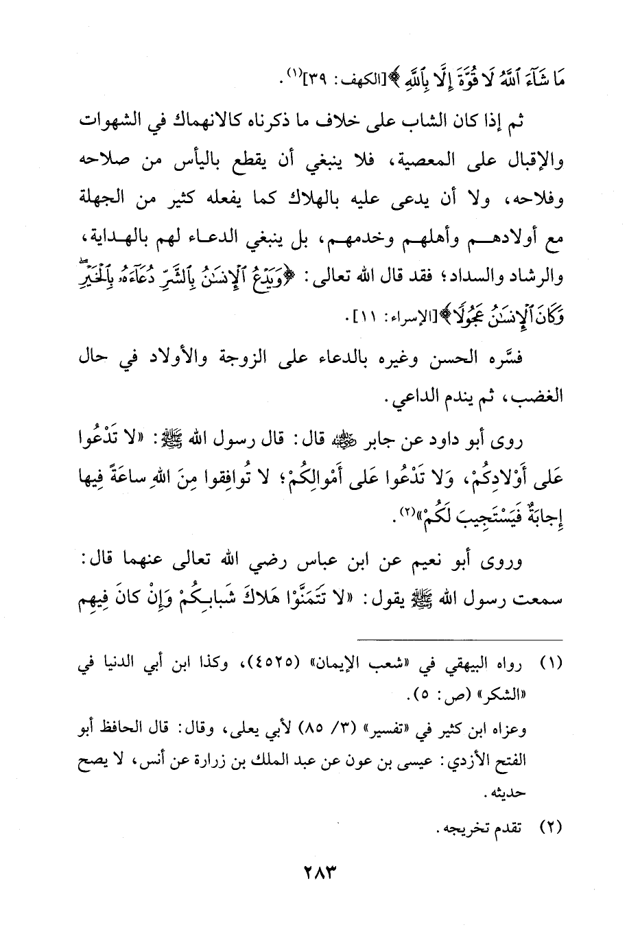 ثم إذا كان الشاب على خلاف ما ذكرناه كالانهماك في الشهوات والإقبال على المعصية، فلا ينبغي أن يقطع باليأس من صلاحه وفلاحه، ولا أن يدعى عليه بالهلاك كما يفعله كثير من الجهلة مع أولادهم وأهلهم وخدمهم، بل ينبغي الدعاء لهم بالهداية، والرشاد والسداد؛ فقد قال الله تعالى: {وَيَدْعُ الْإِنْسَانُ بِالشَّرِّ دُعَاءَهُ بِالْخَيْرِ وَكَانَ الْإِنْسَانُ عَجُولًا} [الإسراء: 11].