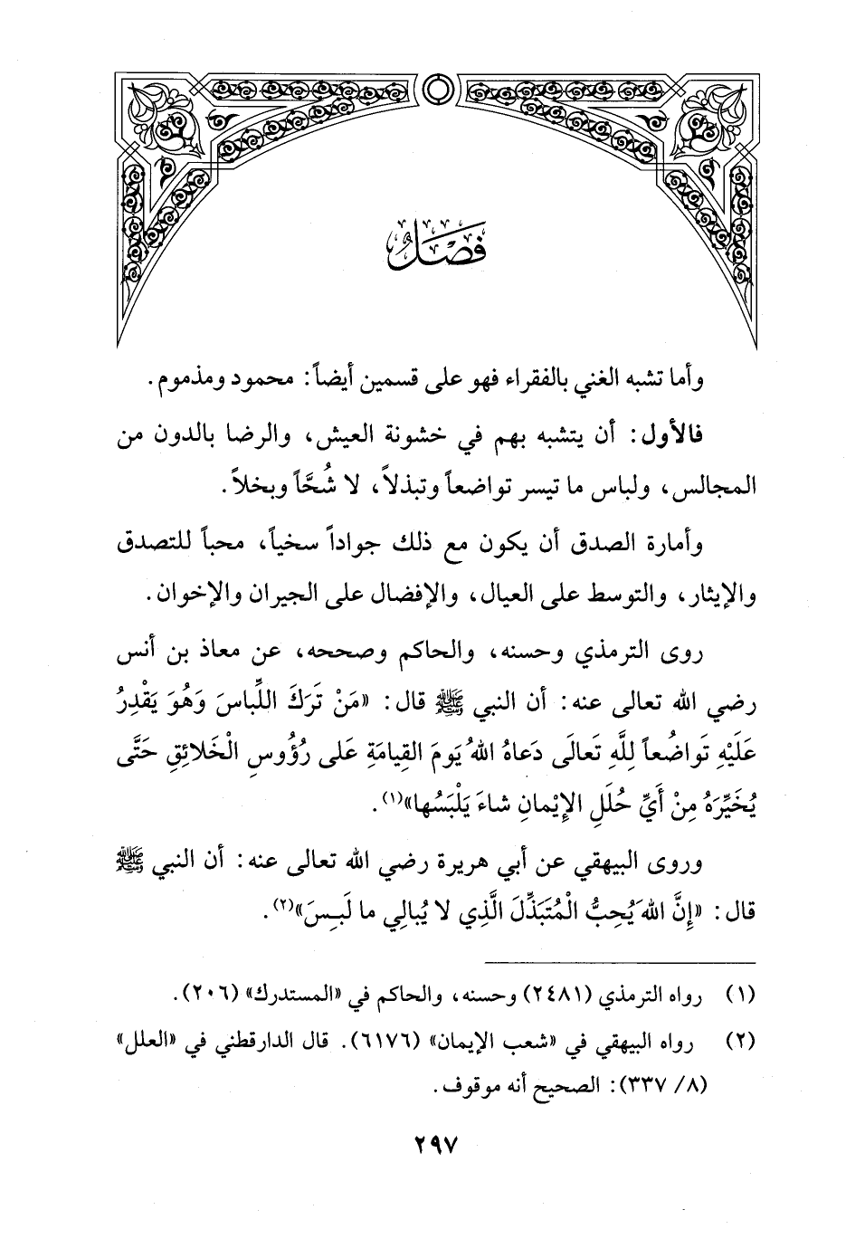 روى الترمذي وحسنه، والحاكم وصححه، عن معاذ بن أنس رضي الله تعالى عنه: أن النبي - صلى الله عليه وسلم - قال: "مَنْ تَرَكَ اللِّباسَ وَهُوَ يَقْدِرُ عَلَيْهِ تَواضُعاً لِلّهِ تَعالَى دَعاهُ اللهُ يَومَ القِيامَةِ عَلى رُؤُوسِ الْخَلائِقِ حَتَّى يُخَيِّرَهُ مِنْ أَيِّ حُلَلِ الإِيْمانِ شاءَ يَلْبَسُها" (¬1).