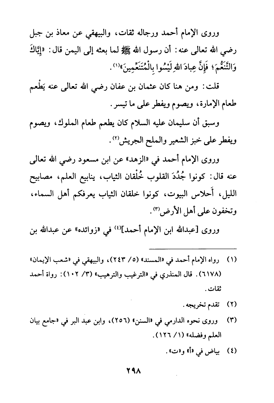وروى الإمام أحمد ورجاله ثقات، والبيهقي عن معاذ بن جبل رضي الله تعالى عنه: أن رسول الله - صلى الله عليه وسلم - لما بعثه إلى اليمن قال: "إِيَّاكَ وَالتَنَعُّمَ؛ فَإِن عِبادَ اللهِ لَيْسُوا بِالْمُتَنَعِّمِينَ" (¬1).