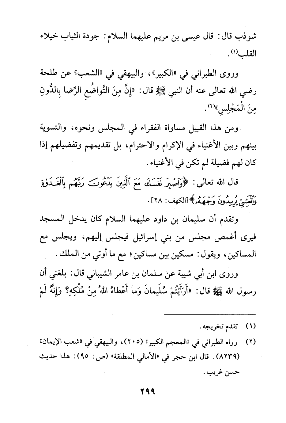وروى الطبراني في "الكبير"، والبيهقي في "الشعب" عن طلحة رضي الله تعالى عنه أن النبي - صلى الله عليه وسلم - قال: "إِنَّ مِنَ التَّواضُعِ الرِّضا بِالدُّونِ مِنَ الْمَجْلِسِ" (¬2).